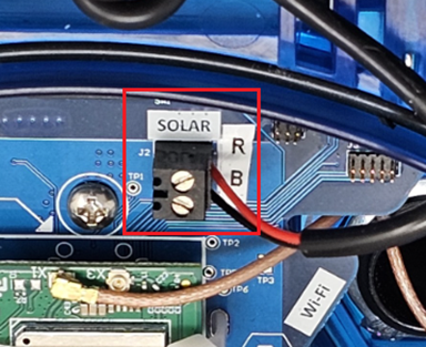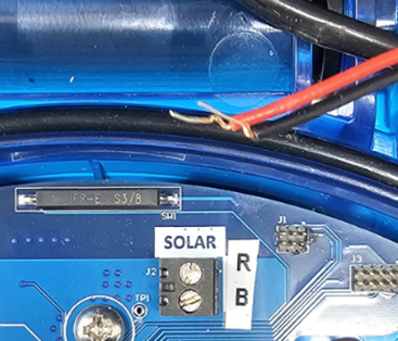 Once the lid is secured the solar panel connection can now be re-terminated. Note: Ensure the Red goes into the (R) and the Black (B) terminations. Use the small flat edged screwdriver to secure into place. Once terminated give a light tug on the wires to ensure they have been secured.