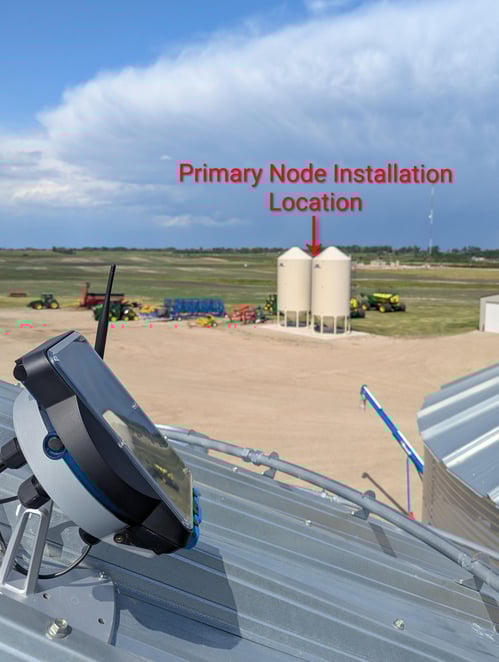 When installing an EPIQ Node there must be clear Line of Sight between the Primary Node and the Secondary Node(s) that are installed at the bin yard. There can be no obstructions like buildings, trees, other bin structures, or even temporary obstacles like a grain truck parking on a weigh scale several times a day. You should be able to see the Primary Node from the Secondary Node installation location.